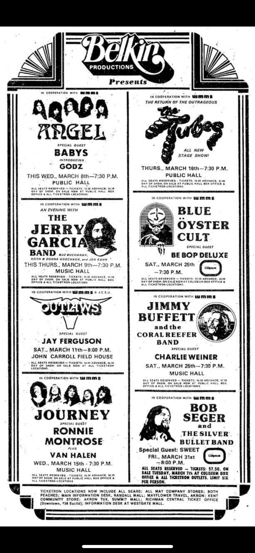 Another thing that was different ( and by different I mean better) in the 70s was ease of access to and interest in live music. I came across a post in a group I follow on Facebook that shared a picture from a newspaper for a series of concerts that a local Cleveland concert promoter was advertising from sometime in the mid-late 70s. There were eight concerts at different venues in the Cleveland area. Each show had two or three groups performing. One show was Journey, with both Montrose and Van Halen as openers. Van Halen was opening….that blew my mind. Another was The Outlaws with Jay Ferguson opening. Tickets were priced from $6 to $7 and could be purchased at Ticketron locations at Sears and May Co. Department stores. In an earlier post I recalled being able to buy concert tickets at Kaufmann’s Department Store, which was a part of the May Company. They could also be purchased at Peaches Records and Tapes stores. Gosh going to the record store was so much fun. Perusing the bins of records was an adventure unto itself.